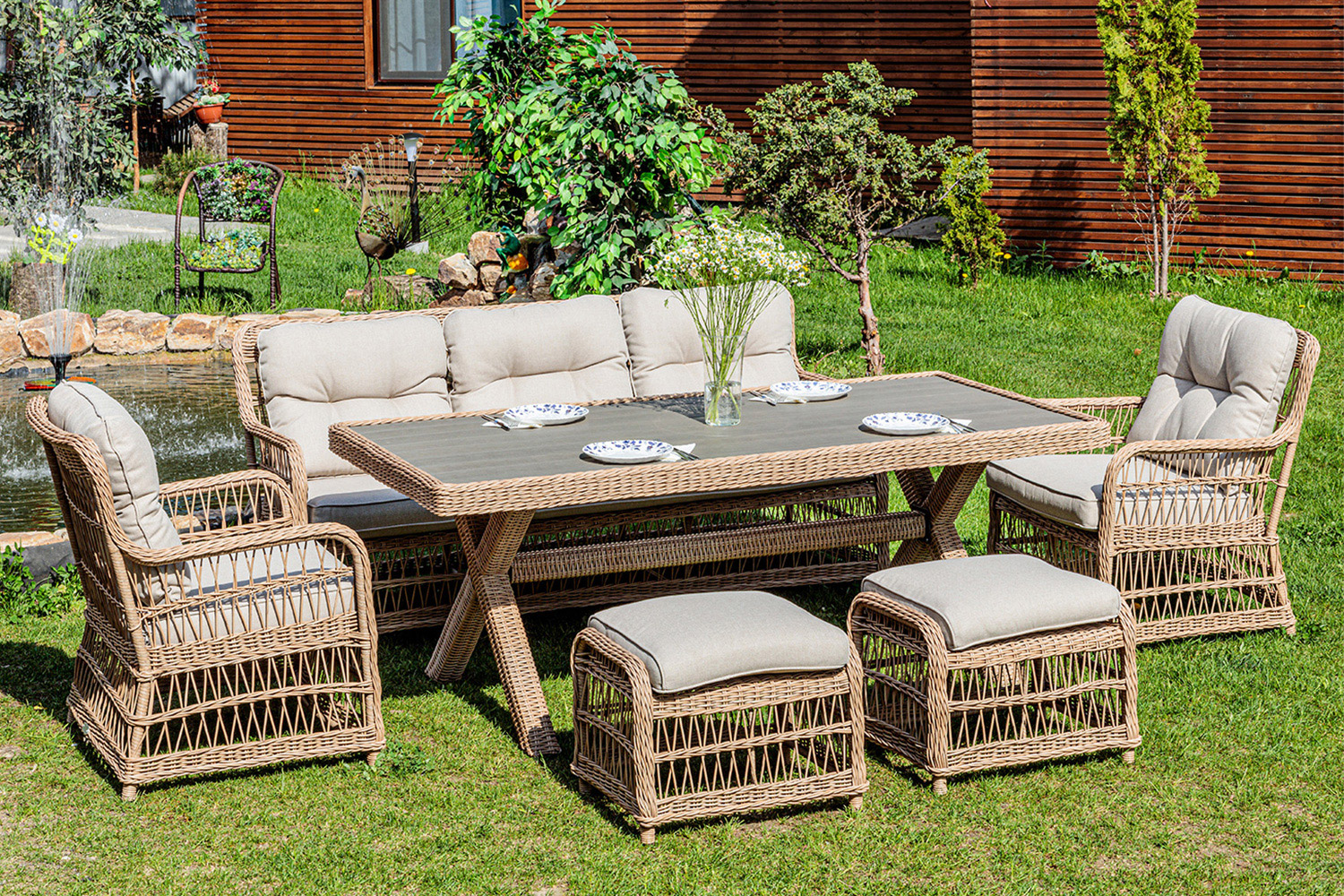 Просторный диван, двое кресел, и два пуфа – идеальное сочетание уличной мебели для людей, которые хотят проводить летние дни на природе. Такой набор позволит устраивать шашлыки или вечерние посиделки большой компании с максимальным удобством, что очень важно во время отпуска летом в приятную погоду.