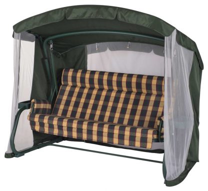 У нас вы можете купить комплект для садовых качелей Милан Премиум (Мерида Премиум). Тент выполнен в бежевом цвете, сделан он из надёжного водоотталкивающего материала, который сможет надёжно вас защитить. Тент предназначен для защиты от солнца и осадков, а москитная сетка защитит вас от комаров и других насекомых. В дневное время вы можете закрепить москитную сетку на крыше для того, чтобы она вам не мешала. Сетка располагается по всему периметру, ни одно насекомое не попадёт в ваши качели, и не испортит вам отдых.